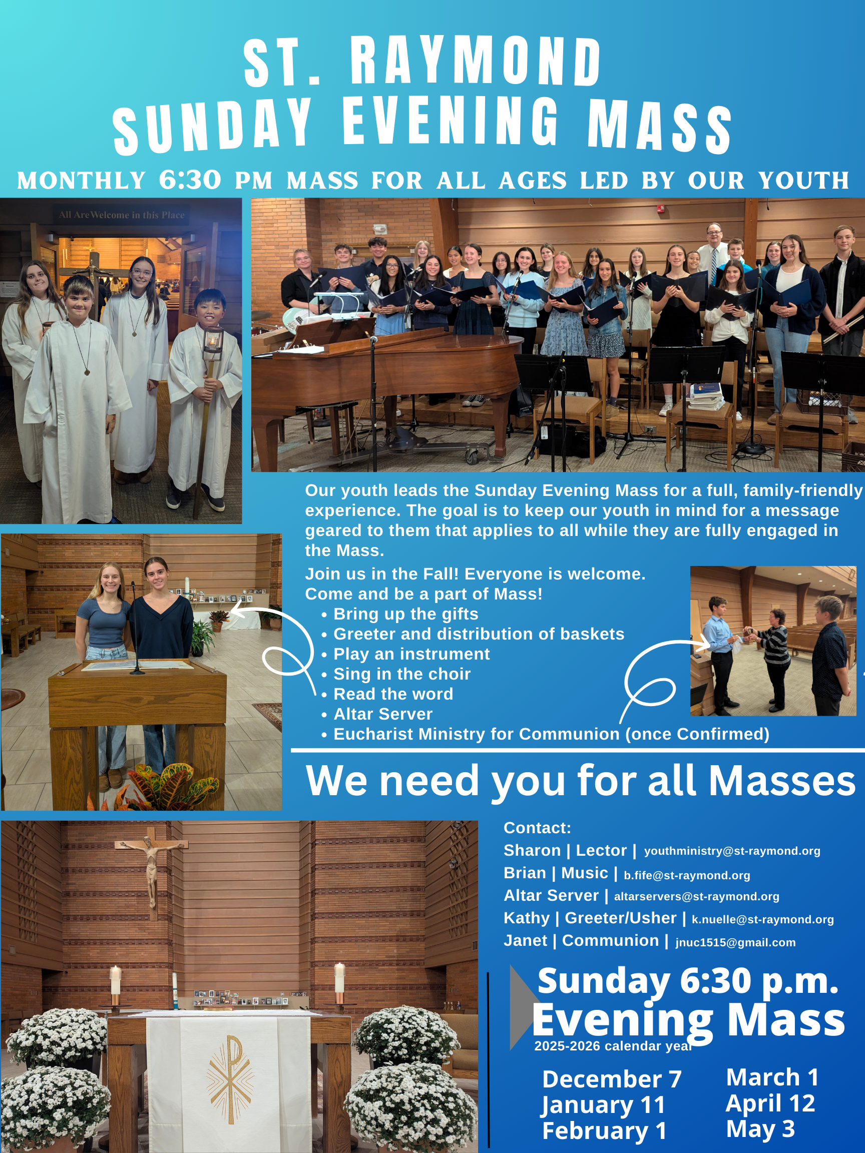 Sun Dec 07, 6:30 pm - 7:30 pm - All are welcome to this Sunday evening mass hosted by the Teens of St. Raymond. Please join us at 6:30...