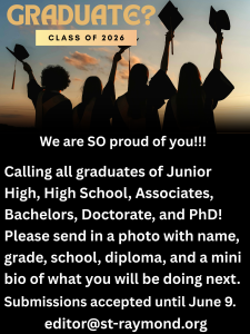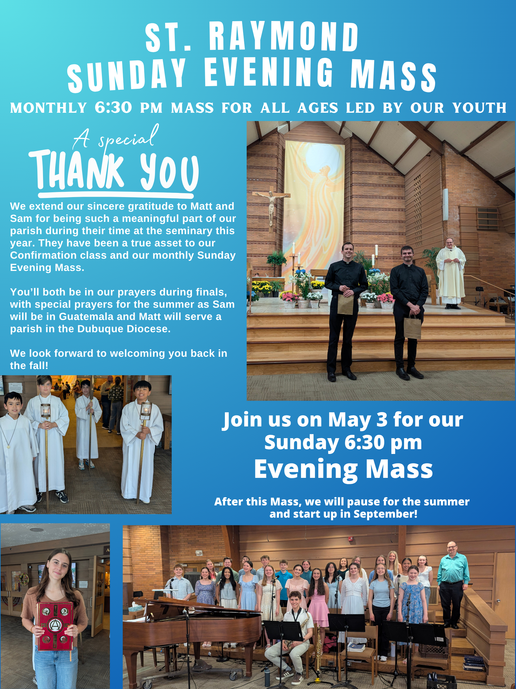 Sun May 03, 6:30 pm - 7:30 pm - All are welcome to this Sunday evening mass hosted by the Teens of St. Raymond. Please join us at 6:30...