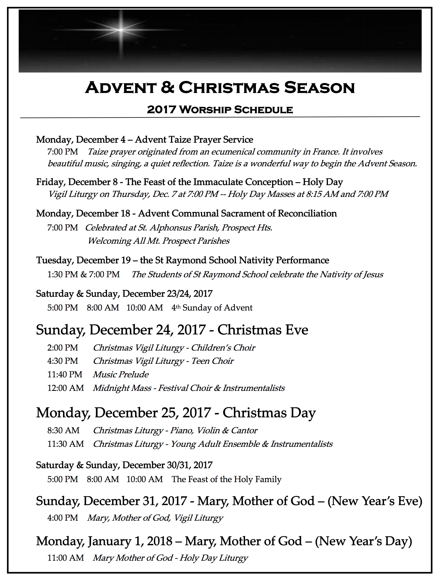 We have a variety of events planned for Advent which include, Taize Prayer, Feast of the Immaculate Conception, Communal Reconciliation Service, and St. Raymond School Nativity Performance.