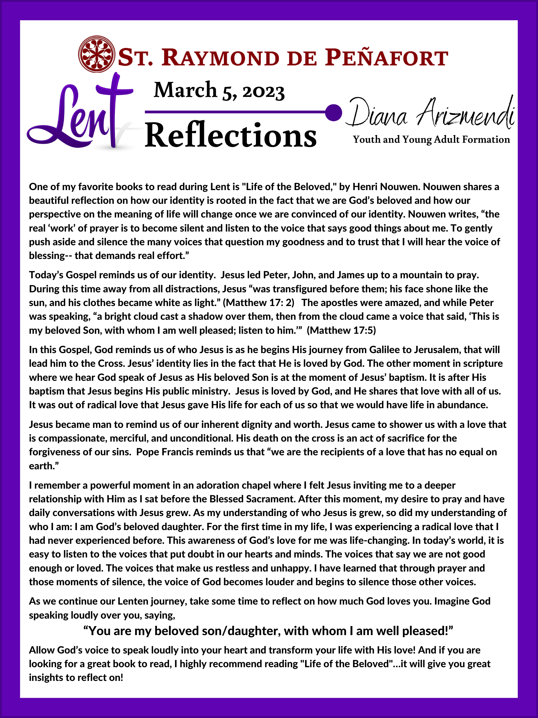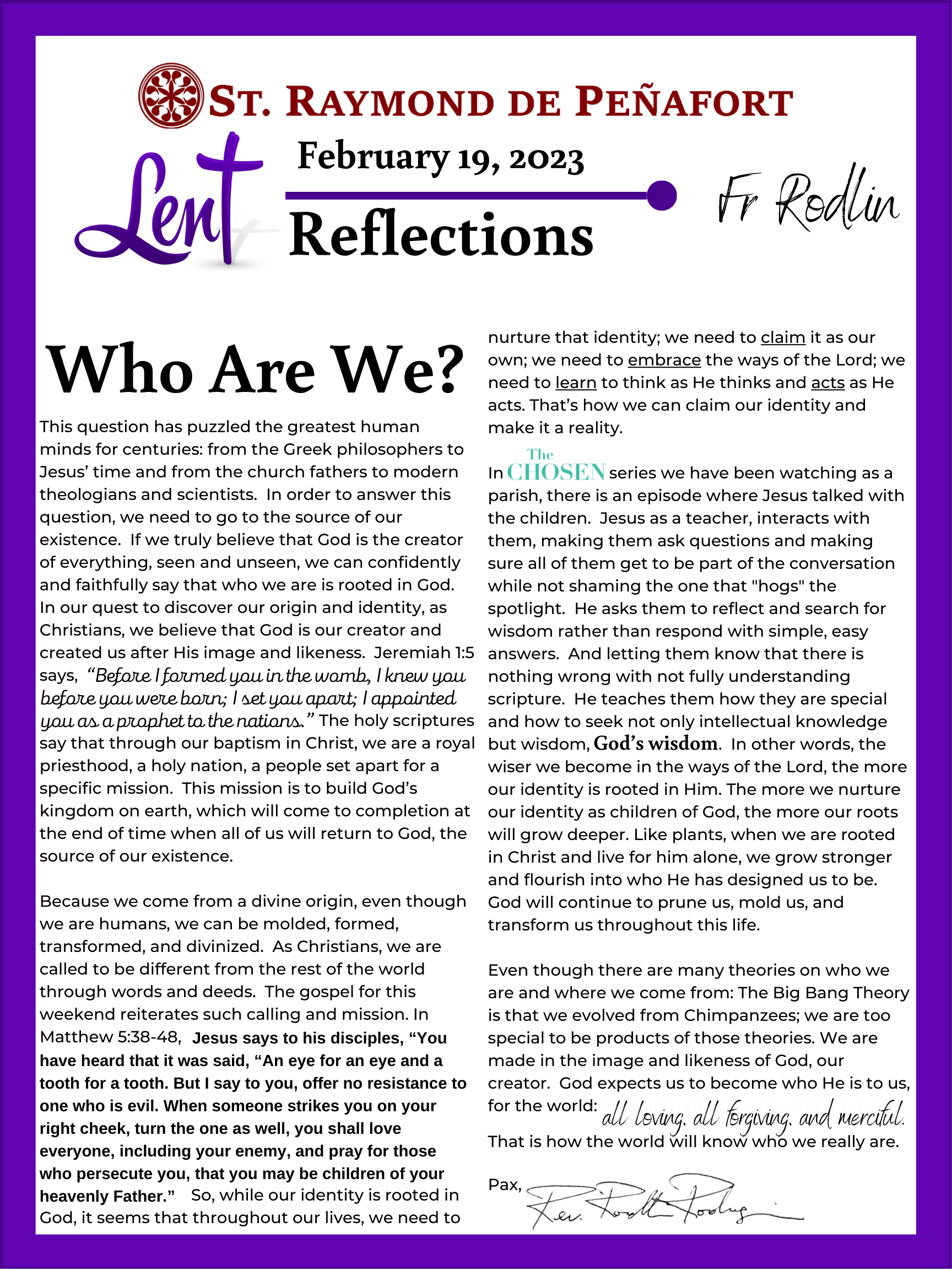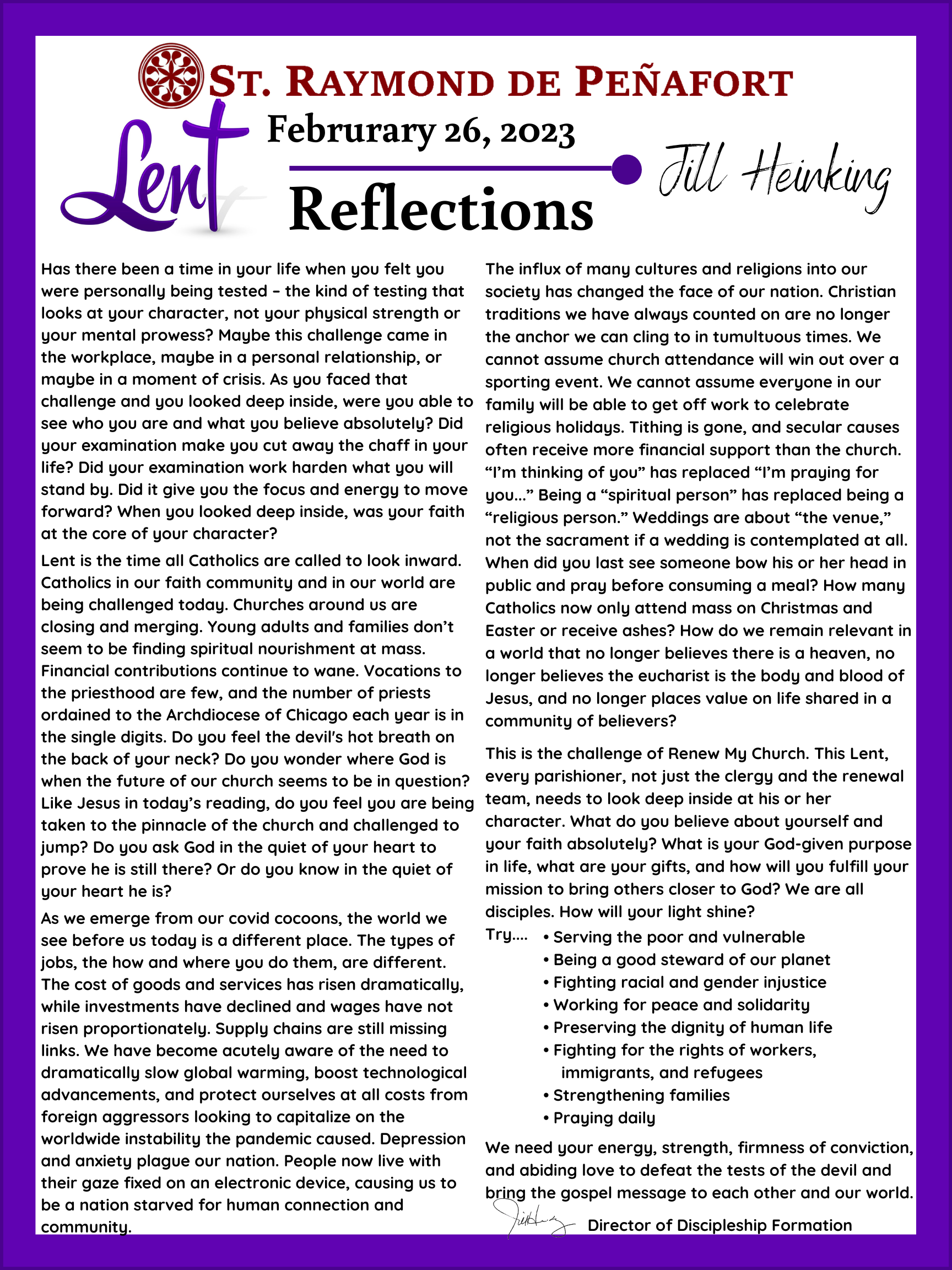 Lent Reflections 2023 Feb 16, 2023 | Uncategorized Fr Rodlin Fr Rodlin 2 Brian Fife Fr Rodlin Jill Heinking Diana Arizmendi Fr Rodlin 2 Sr Val Deacon Dave Brian Scott Jill Heinking Sr Val Fr Scott Diana Arizmendi Deacon Dave