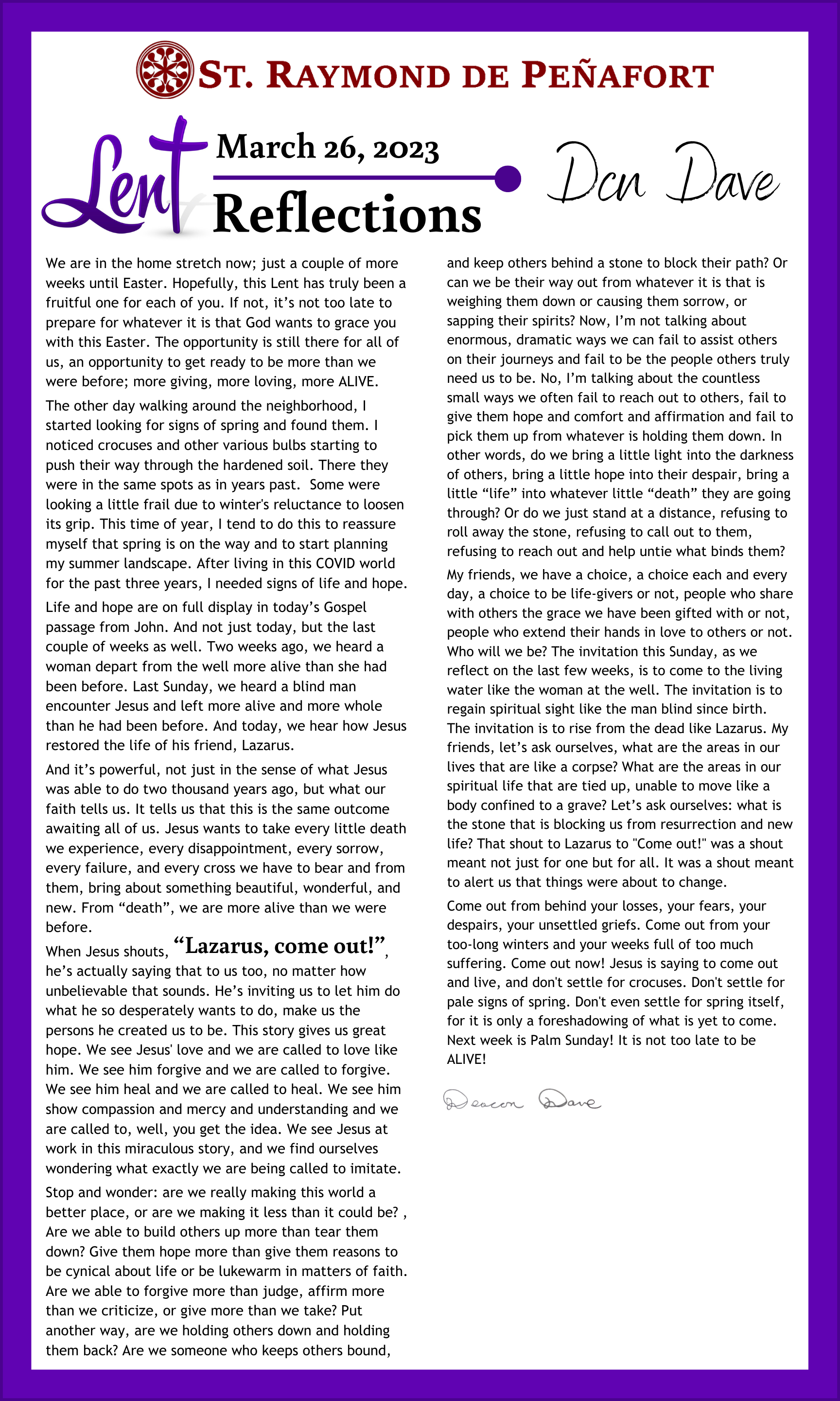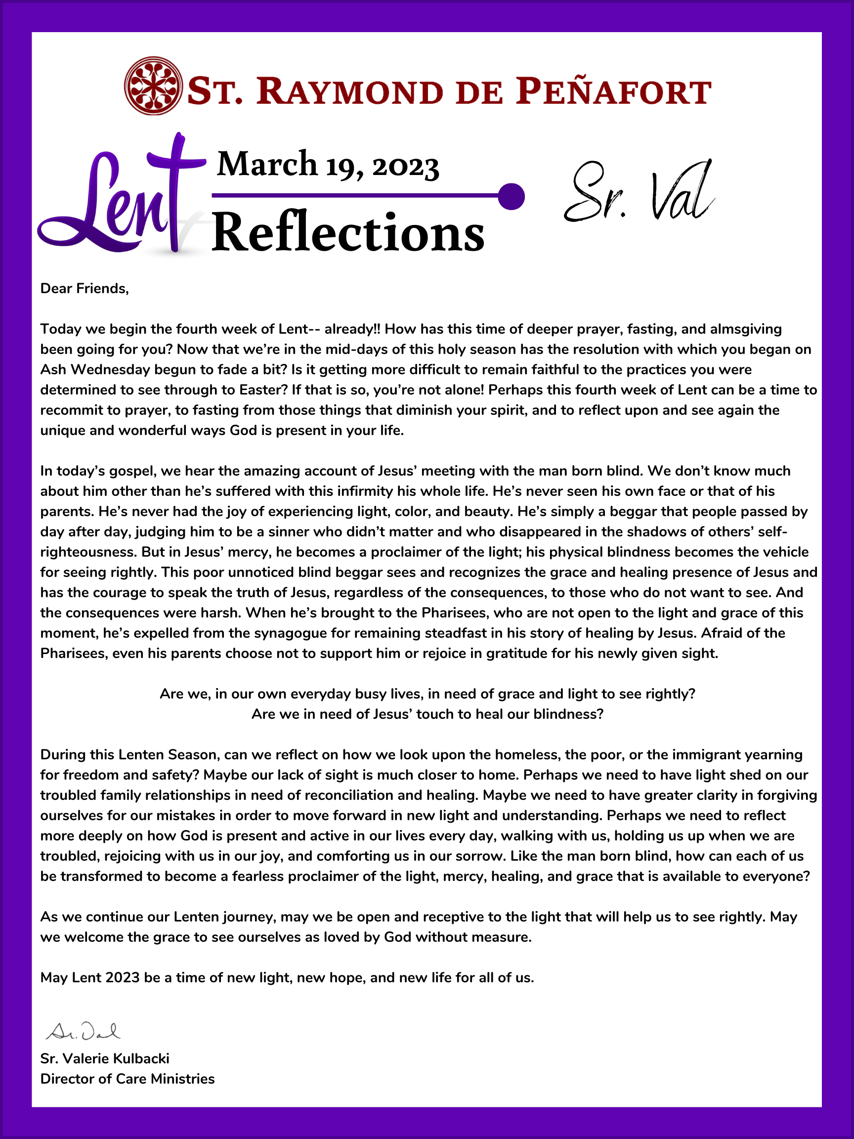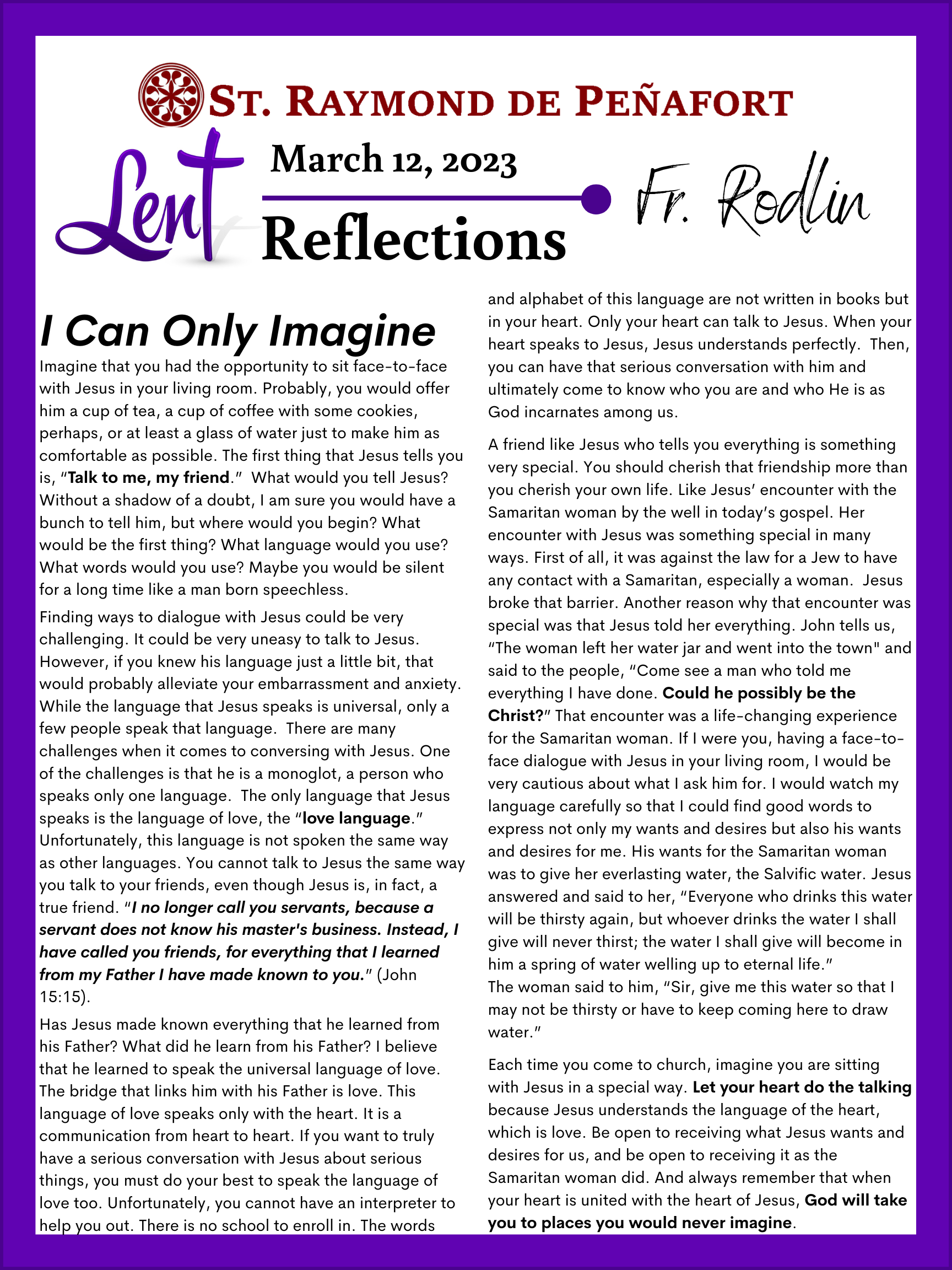 Lent Reflections 2023 Feb 16, 2023 | Uncategorized Fr Rodlin Fr Rodlin 2 Brian Fife Fr Rodlin Jill Heinking Diana Arizmendi Fr Rodlin 2 Sr Val Deacon Dave Brian Scott Jill Heinking Sr Val Fr Scott Diana Arizmendi Deacon Dave