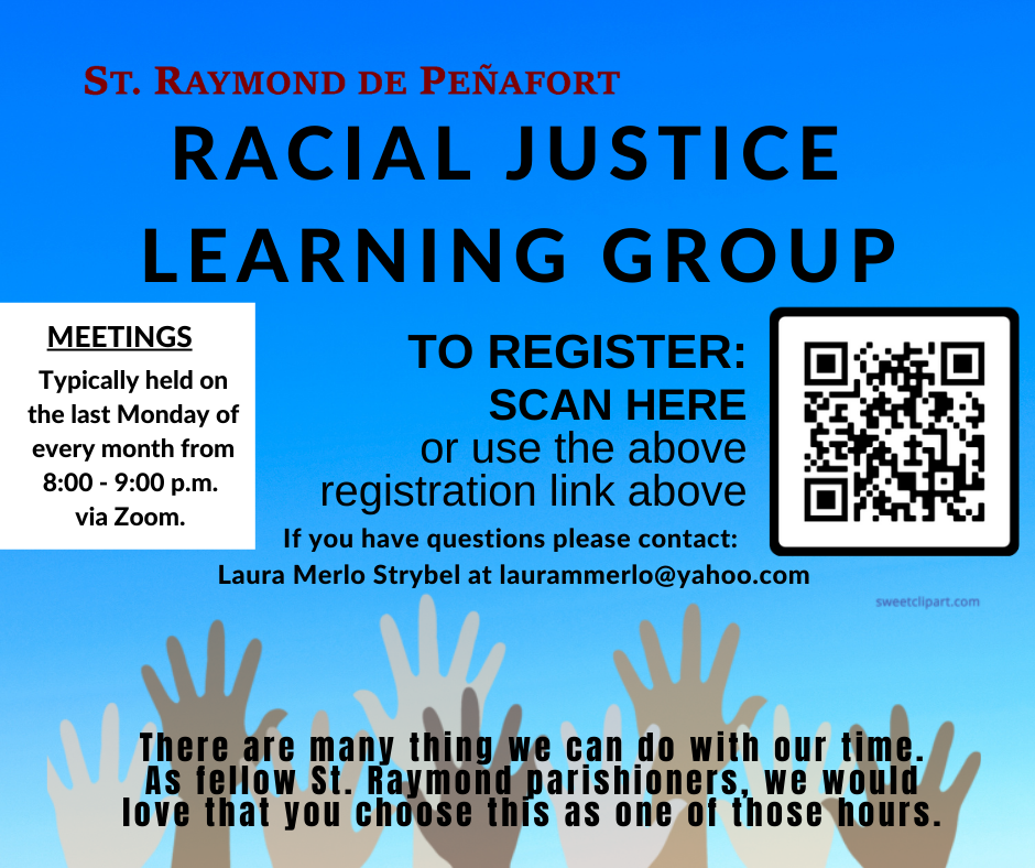 This ministry works both locally and with an Archdiocesan-wide cluster of churches toward the elimination of racial and ethnic discrimination. Opportunities for participation in this ministry are available throughout the year and are open to anyone seeking to better understand racial inequity, learn more through dialogue, have an open heart to the love of Jesus Christ for each one of us. Please see below for more information and to register for the next meeting through zoom.