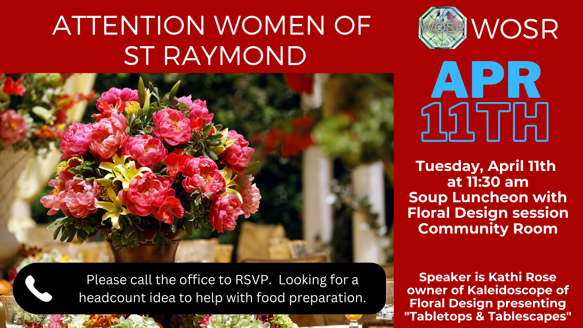 4-1-25  Tuesday  Soup Luncheon & Speaker Leslie Goddard   11:30 am in the Parish Community Room