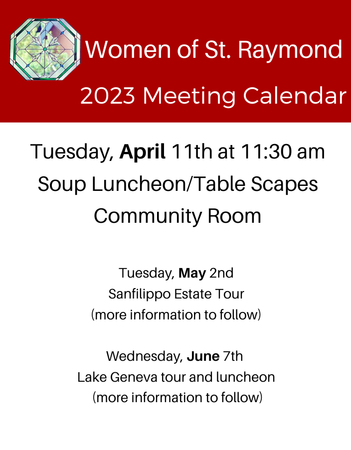Sun Apr 12, 6:30 pm - 7:30 pm - All are welcome to this Sunday evening mass hosted by the Teens of St. Raymond.  Please join us at 6:30...
