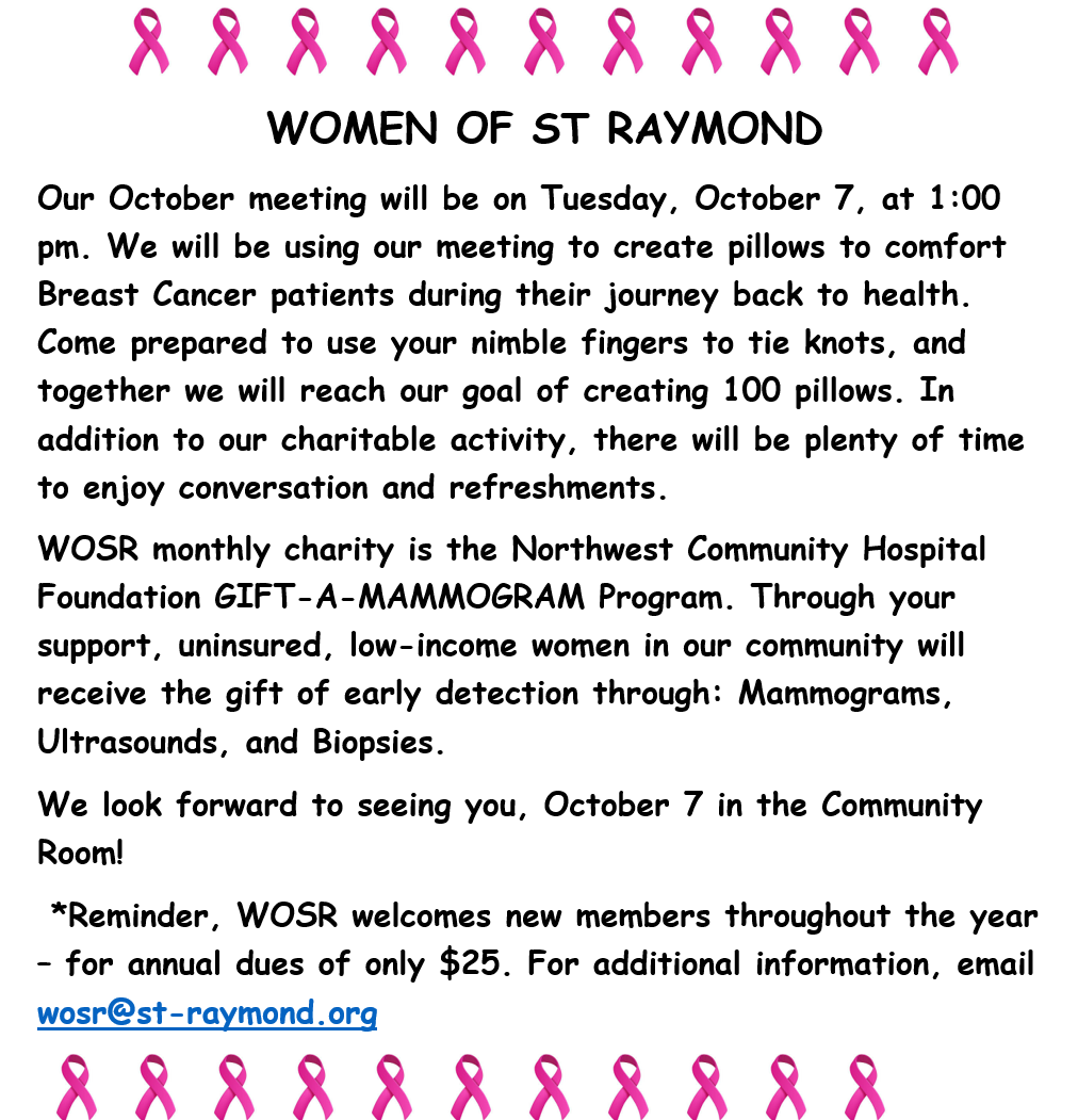 10-1-24 Tuesday Breast Cancer Pillows 1 pm in the Parish Community Room