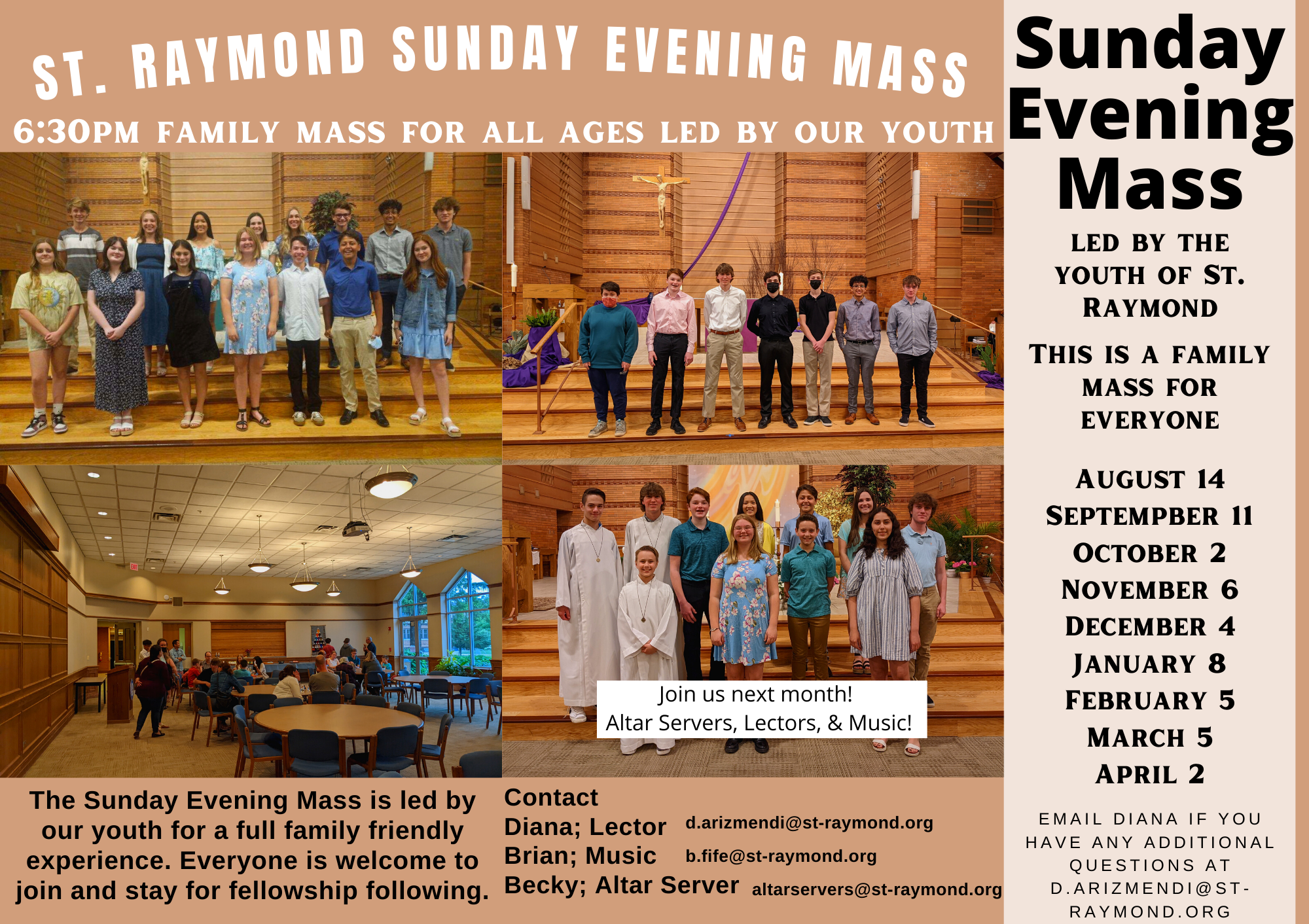 All are welcome to this Sunday evening mass hosted by the Teens of St. Raymond.  Please join us at 6:30 p.m.