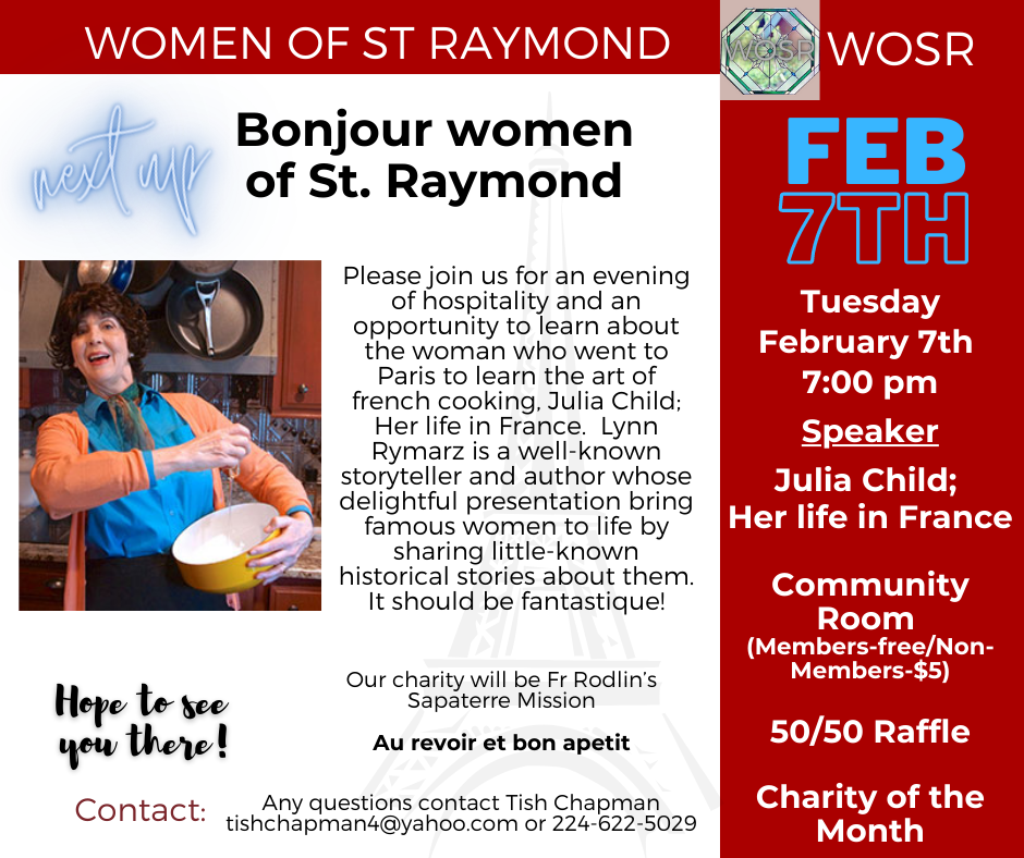 Join us for Speaker: Lynne Rymarz/Julia Child in the community room at 7pm. Light snacks, 50/50 raffle