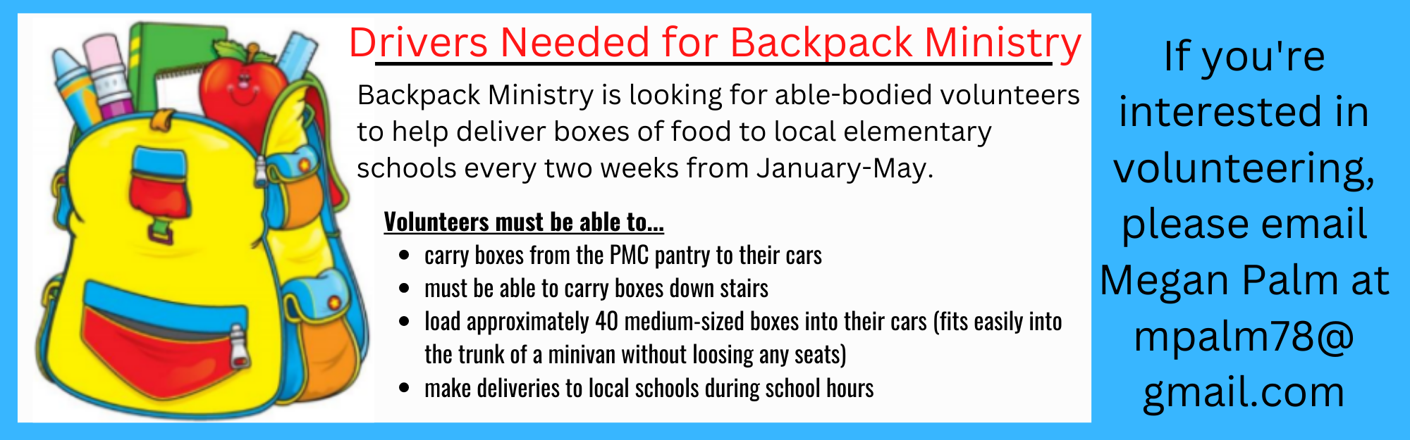 If you would like to DONATE to the Backpack Ministry to help us purchase supplies, please make a donation through Give Central. We appreciate all of your support–Thanks so much!