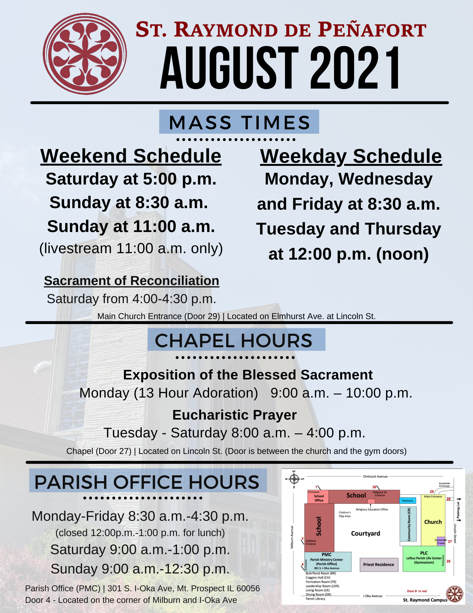 The parish continues to offer a live stream Mass on Sunday at 11:00 a.m. through our website’s main page; we hope you will continue to participate. Homilies of Masses are also available through our homilies page and Spotify.