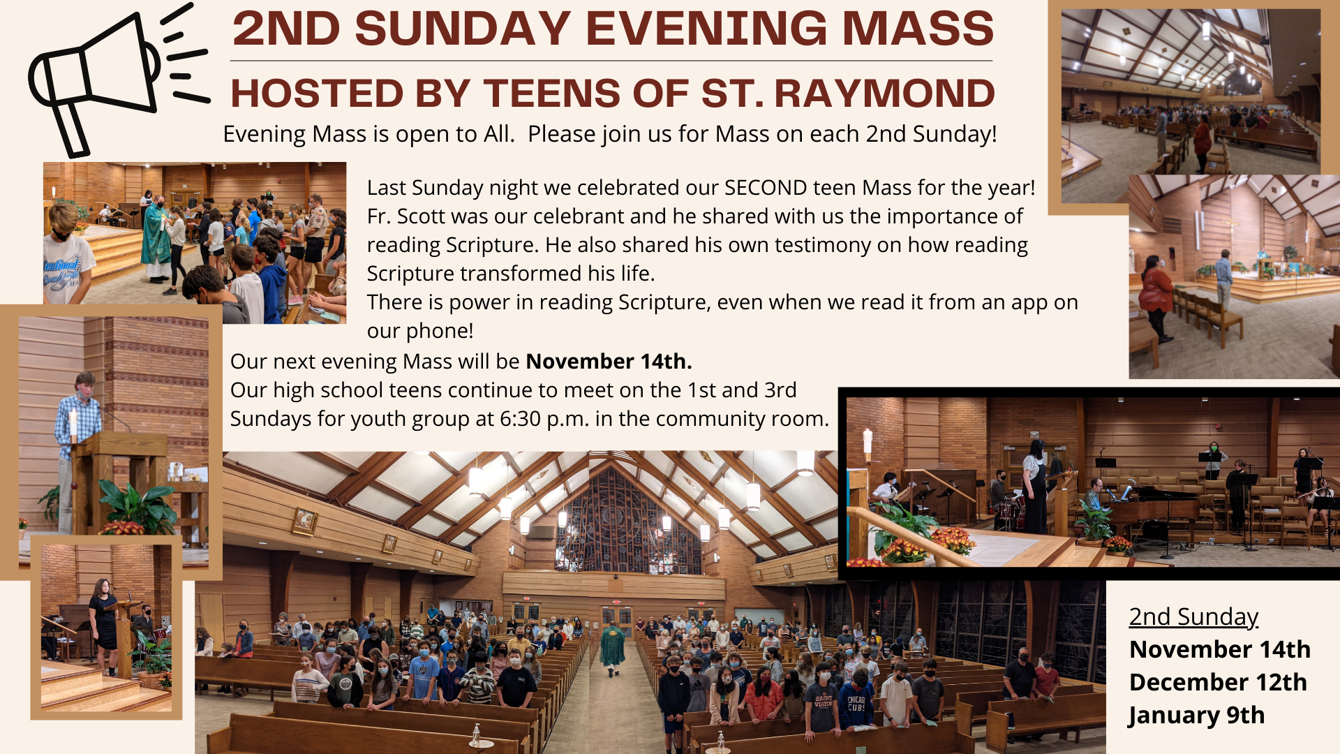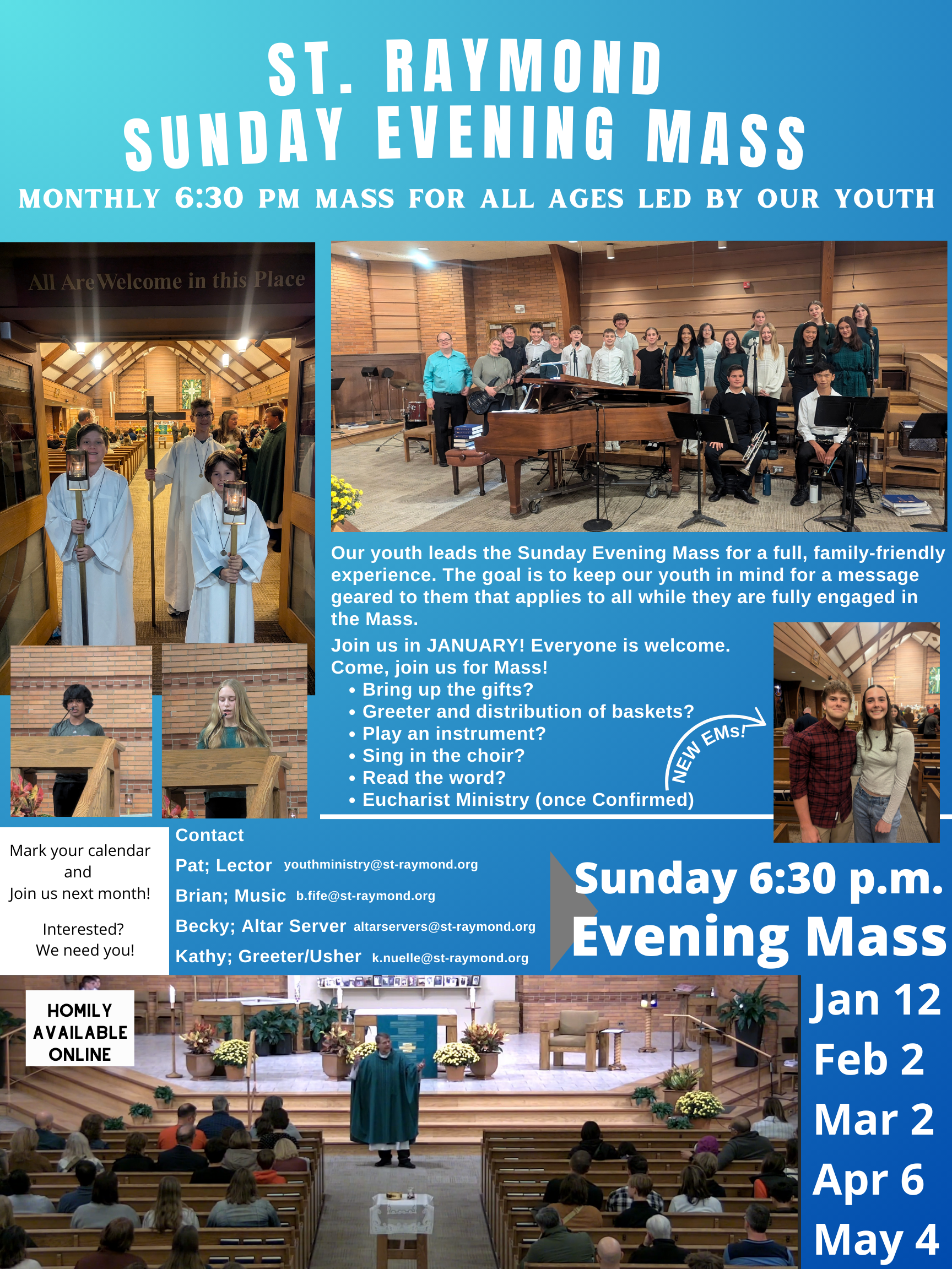 The youth of St. Raymond are invited to participate in all parts of a Sunday Evening Mass. Please get in touch with the appropriate coordinator to get involved.
