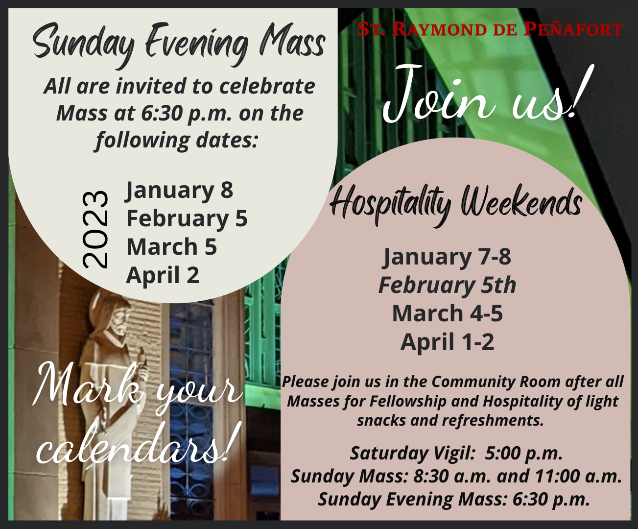 Sunday Evening Mass on select dates: 6:30 p.m. Upcoming dates are listed (paused for Summer):