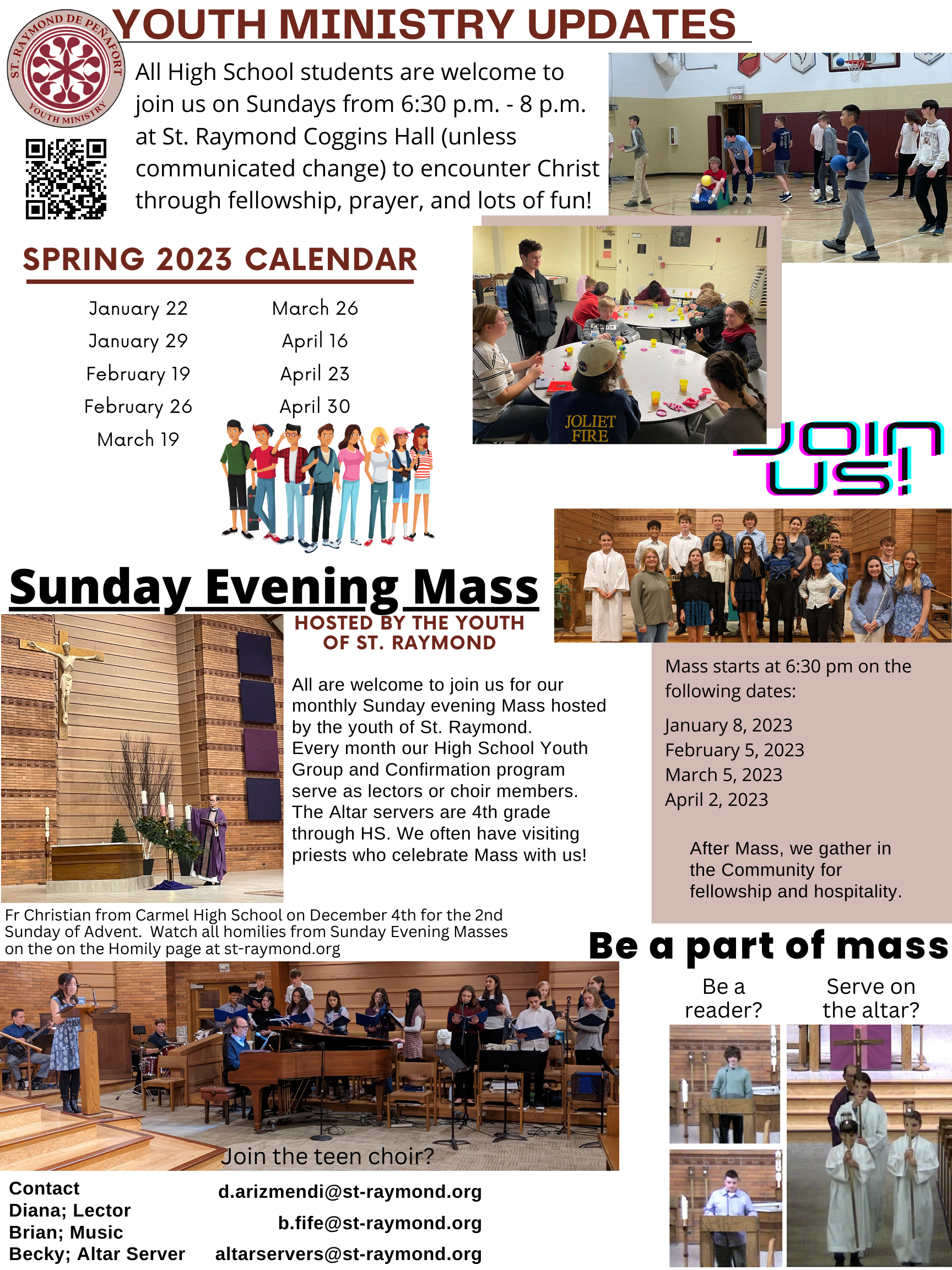 – Email: youthministry@st-raymond.org or p.mcgarry@st-raymond.org